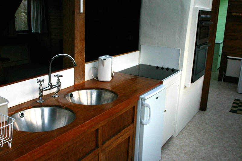 Don't laugh, there are not one but two convection ovens, a nice little fridge, and one of those space age countertops that looks like a plate of black glass with circles on it. The sinks are two stainless steel buckets with drains in the bottom. Very cool, in my humble opinion, and all you need to make two or three meals a day. Ambience is what it's all about with this place.
