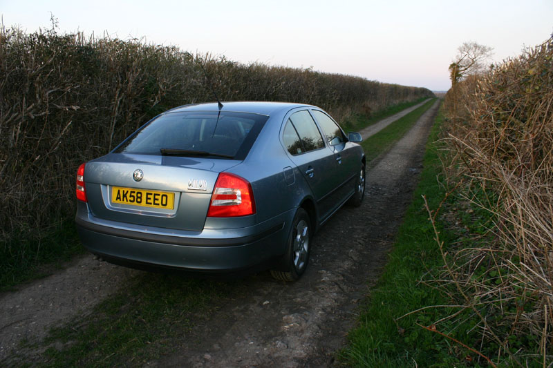 Here's a real "farm road". No passing here either, obviously. This is my usual rental car, a Skoda Octavia, which is essentially a VW Passat with Skoda badges, since VW bought them after the iron curtain fell. This diesel 5-speed gets about 42 mph average, and I pretty much flog it. It has plenty of power and is very smooth and quiet. I want one. Why was I in a field? To retrieve my bike after walking back from a long ride. I had a flat tire, and no pump! Did about 10 miles of bike riding and 5 miles of walking, so I got my excercise for the day. I have a thorn-proof tube and a pump now...