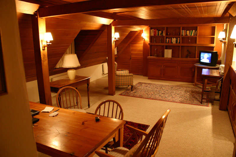 Here's the "living room". Yep, that's real post and beam construction, tenons, pins, and all. You should see the beams in the barn where my bike lives...some of them are pushing two feet tall, and all were hacked out by hand. The TV gets three channels, all of which are BBC. They have one or two good shows per night, comparable to National Geographic documentaries, and their quality is beyond reproach. I spend my time writing web pages though.