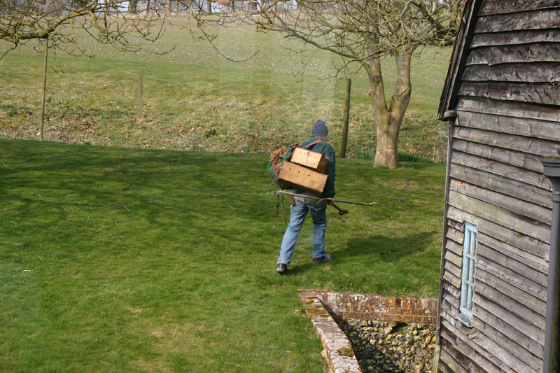 This guy is the "ferreter". I thought he was kiddin' at first, because he drove up in what looked like a plumber's truck, complete with ladder on top. Maybe that was his daily job, and this was a Saturday. He also had a dog. I joked "is that a ferret dog?", and he said "yup". It was an Airedale, I think. That's probably British for Ferret Dog :). The wooden boxes on his back have ferrets inside, which are used to "ferret out" rabbits, which he then disposes of "in the bin". I can ride through the fields on a bike and see ten at a time, so rabbits are a real problem here, as are moles. Moles are apparently easily trapped by putting a trap over their holes, but that's just something else to have to stay on top of, literally.