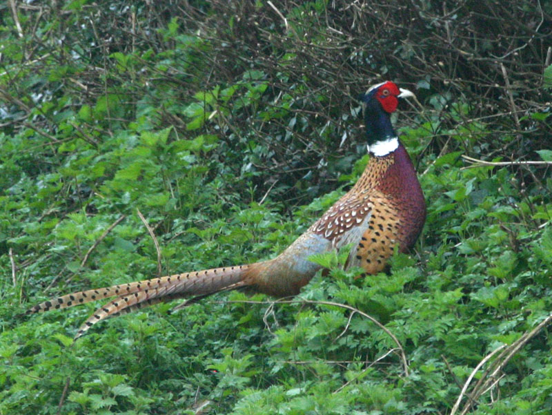 I've already seen my share of pheasants...they're everywhere. Apparently these guys would rather be hit by a car than have to fly over the hedges, otherwise I wouldn't have been able to make this picture. They remind me of Turkeys, as far as reluctant aviators go. I got the scare of my life the other day while bike riding. I was riding along minding my own business, and a pheasant flew up from abut two feet in front of my tire. Since I was going about 10 mph, by the time I got to him, he was flapping around like crazy, basically beating me about the head and shoulders. This is my new definition of instant heart attack, and now I'm real careful about looking for that pheasant along the the uphill path that's adjacent to the horse pasture, about 10.5 miles into the ride...