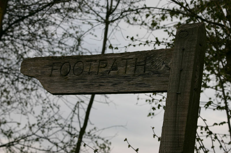 This is the typical footpath sign. Bridleways (horse paths) are similar. I think it's legal to ride a bike on a bridleway, but I'm told you'll have no trouble riding a bike on a footpath either. Now that things have warmed up a little, I meet an average of one or two people (and their dogs) per mile. They are all very friendly and quick to laugh at my silly quips as I meet or pass them.
