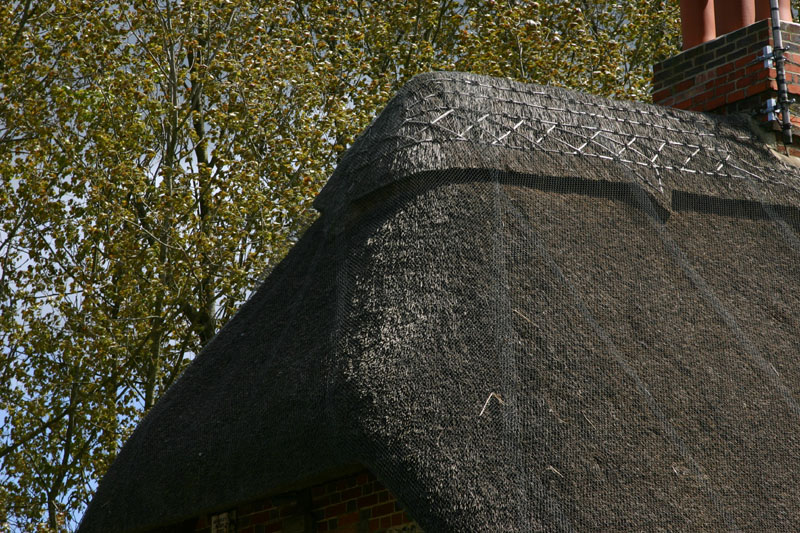 Thatched roofs benefit from the wonders of chicken wire, although it may be called rabbit wire here.