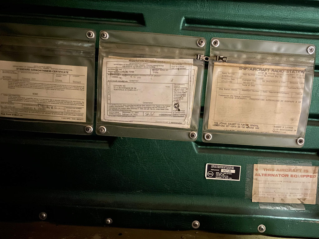 All STCs, ADs, 337's and other requirements have been complied with, as well as all aircraft logs and engine data from "day one" testing at the Cessna factory.... all available for inspection at the hangar. There are hundreds of pages of this data, all organized into file folders. I'm still looking for a full "equipment list", but panel photos should give you a pretty good idea. Instructions and installation manuals and procedures for items such as the JPI fuel totalizer, GAMI injectors, radios and other equipment are included also. This is a very well documented plane.