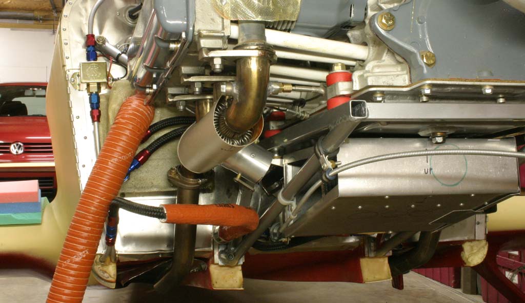 Here's the final installation. I have well over a hundred hours in the design and fabrication of this thing, not counting time spent looking in every hardware store in town (and McMasterCarr) for a door spring. The heat muff is held on with safety wire. The ram air is going to just suck from the cowling for first flights. Later I'll poke a hole in the cowling and stick a 2" tube in this hole, and see how much difference cold ram air makes. My guess is about 200 rpm. But for first flights, getting used to flying the plane, and testing, I don't want any surprises that I might get from ram air. The ram air inlet is a velocity stack from a 40 IDF Weber (previously used on the Ghia, before the 48 IDFs spiced things up).