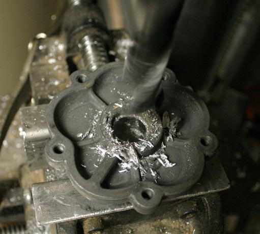 So I got an OEM magnesium pump (thanks, Mike Moyer), disassembled it, soaked it in carb cleaner for a few days, and then drilled the base through with a 5/8" drill bit. This opened up the base to as large as I dared. This gave me the biggest hole to the outside world, so the air/oil mix velocity would be as slow as possible.