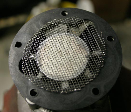 Then I cut out a thin sheet of aluminum to fit over the circular boss on the upper side, and used JB Weld to epoxy it in place. Then two of the diaphragms were hacked up to resemble gaskets for above and below this "center section", and a piece of stainless steel screen perched on top.
