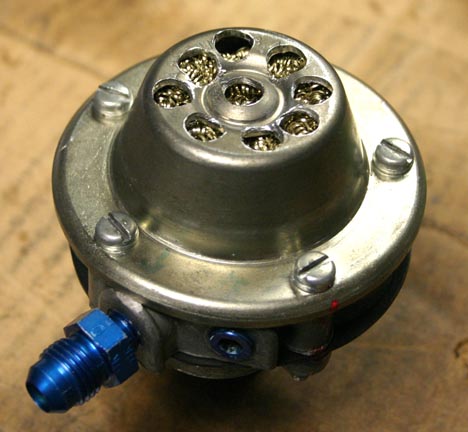 For about two years now, I've been trying to think of a good way to vent crankcase pressure without letting it take my oil with it. Street cars don't have much of a problem with it, but with an airplane engine running almost wide open for hours at a time, it's a real issue. What I used on my 3100cc engine worked OK, but two pinholes in the weld leaked a little oil, and I'll admit it was fairly hideous. It consisted of a 3" aluminum can welded onto a 1/8" plate that covered the top of the engine, and filled with filter material (OK, it was Scotchbrite, but I never said it). It was vented to an AN-6 fitting which dumped a few drops per flight overboard.