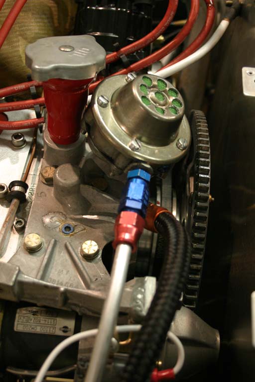I kept looking for a "big hole" in the case that I could tap into without having to do anything extra, such as welding fittings onto the valve covers. Since I'm not using the factory's mechanical fuel pump, that .925" diameter hole was mighty enticing. It occured to me that if I hogged out the fuel pump's innards and filled it with something to trap the oil droplets while also venting the top to the atmosphere, that might allow the oil to cool and collect on the stuff on the way to allow the pressure to vent to atmosphere.