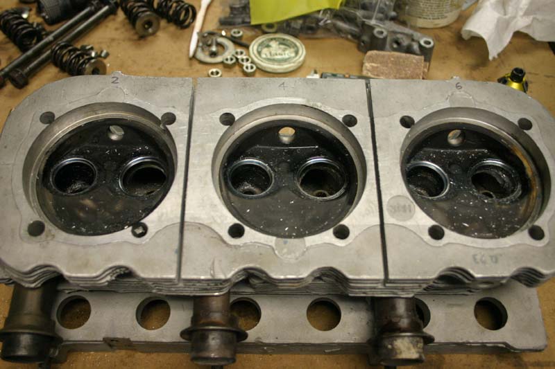 Another nice feature of the old original 3100cc 110 hp heads is that they have good valve guides and I already knew the combustion chamber volumes, so I just freshened up the valve job and called it "good enough for KR work". The reason I didn't plan to use them on the Phoenix engine is because there's a little more port corrosion and chamber damage on these than I like. I did check them for pitting before I started this exercise.