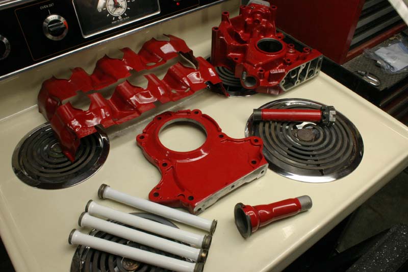 I needed some more pushrod tubes powder coated, but couldn't find anybody in town that does that anymore. I guess the do-it-yourself kits have put them out of business, so I visited Eastwood's website and bought a kit for myself for a hundred bucks. I picked up an oven at the local thrift shop for $50, and went to work. [You're not supposed to cook food in an oven that's been used for powder coating.] Each part is grounded and then the powder dusted on with a static charge. Overspray is minimum, and there is no smell. Bake at 350F degrees for about a half hour, and as soon as they cool, you can install them!
