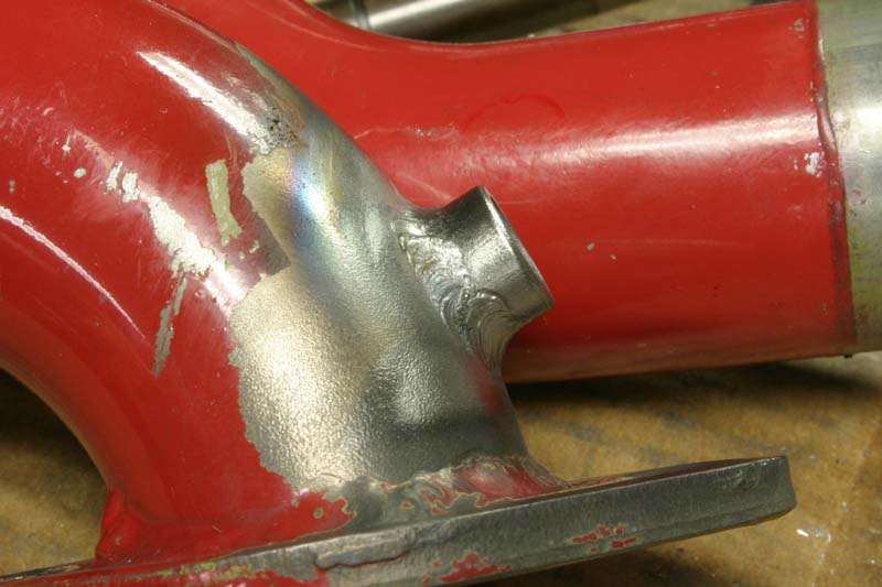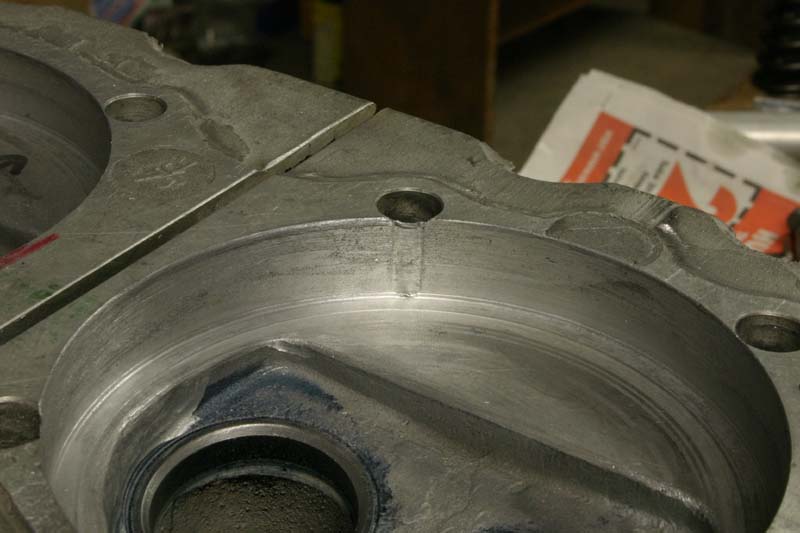 After the hack job, I machined away the welded stuff to create a flat gasket area. The underside of the hole was then radiused with the die grinder to eliminate the sharp edge.