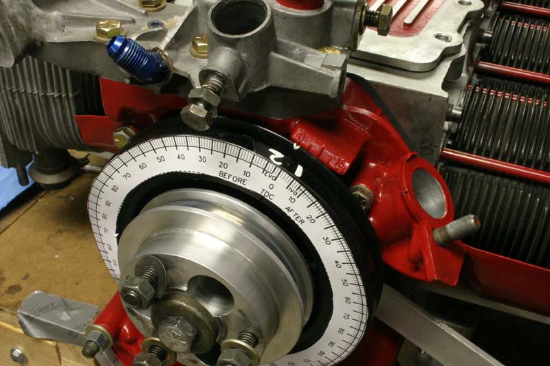 I resurrected the CorvAircraft degree wheel to check for proper cam installation, and so I could mark this new Dale Manufacturing pulley for 32 degrees of total advance for timing purposes. The 1 2 shown on the pulley is there so I'll know which cylinder fires at each of the three 120 degree locations on the pulley. The first number is the one that fires the first time around, and the second number is the cylinder that fires on the second revoltion. This makes it easy to figure out which cylinder is at TDC on the firing stroke during a differential compression test, and also when trying to figure out which cylinder doesn't have the right compression while spinning the prop through, or something similar. This brings up valve adjustment. The GM manual gives a simplified valve adjustment procedure whereby you adjust all the valves by only rotating the crank one time. I do it the way you do in on a VW (or any other normal car), at TDC for that particular cylinder. It takes a few more minutes, but I don't get confused that way.