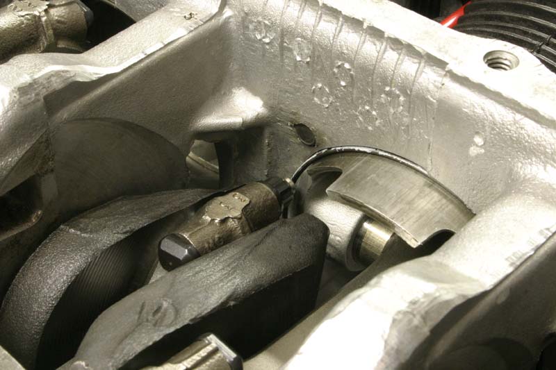 This engine uses a reground OT-10 cam (the new one in the first engine was damaged by metal chunks shed from cam and crank gears), which helps keep the valve train geometry closer to stock pushrod length. I used new Sealed Power lifters and the new rings are 94mm Total Seals.