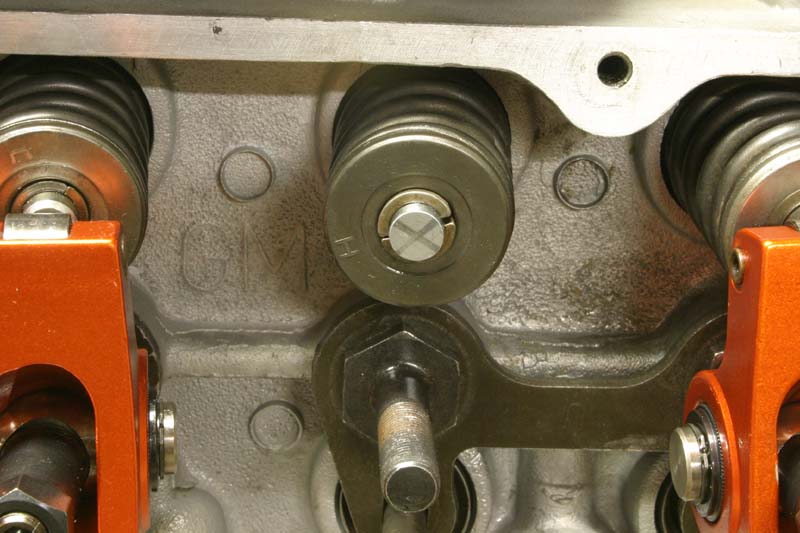 The two lines you see on this valve stem show two things. 1) the valves don't rotate when used with roller rockers, and 2), the contact area is a line the full width of the valve stem, rather than a smaller sliding point as with the stock GM valve train geometry. The roller tips substantially reduce side loading on the valve stem, reducing wear and friction losses.