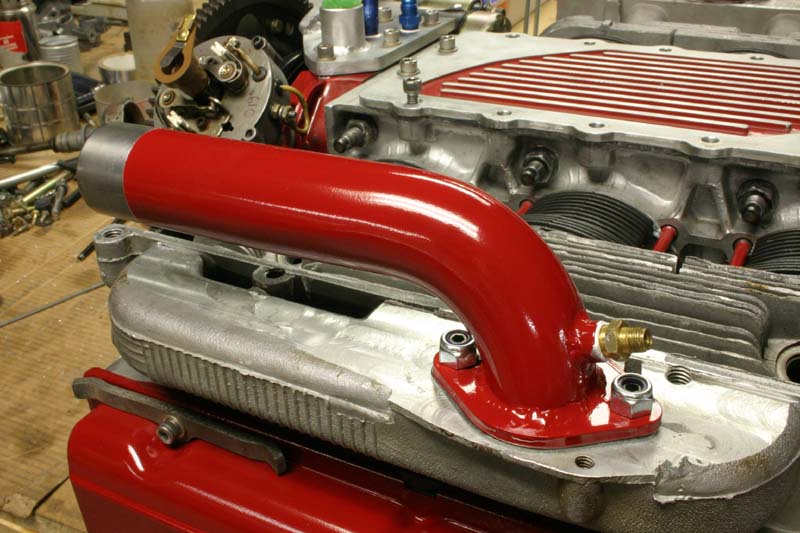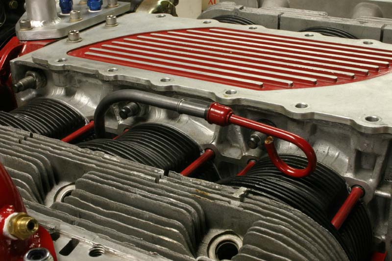 Even the dipstick tube was improved by lowering it with a tighter curve and then powder coated. This will allow the cylinder baffles to follow the dipstick around the curve, so I won't have to cut a slot in them to dodge the tube. You can see the ARP case studs in the background. William Wynne installed these in the case for me. He has an alignment fixture that he made to assure case alignment while boring the holes.