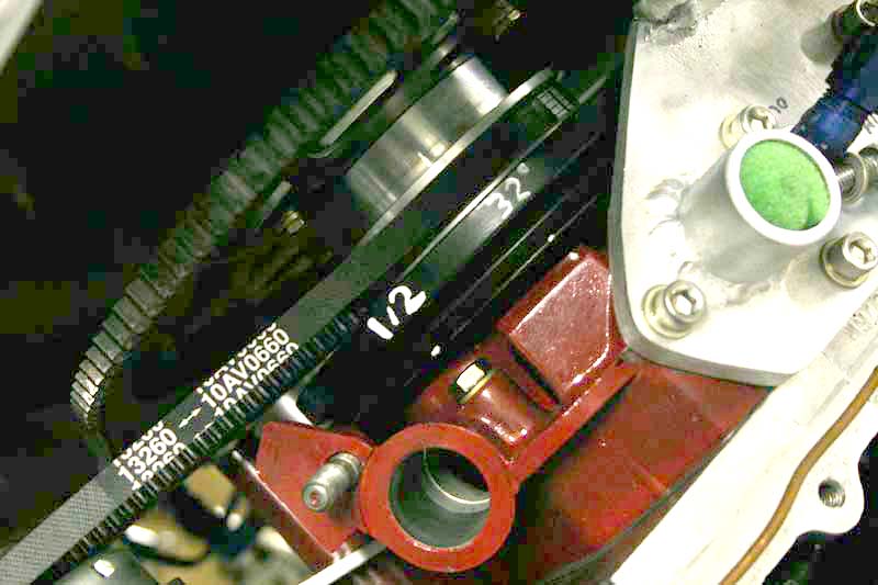 Here you can see the extra mark (in white) that I added at the 32 degrees BTDC (before top dead center) for use when setting the total timing advance, which is done at high rpm with all advance in. I have an advancing timing light, but this helps eliminate all possiblity of error, and makes it easy to set the timing statically (by twisting the rotor to get full advance).