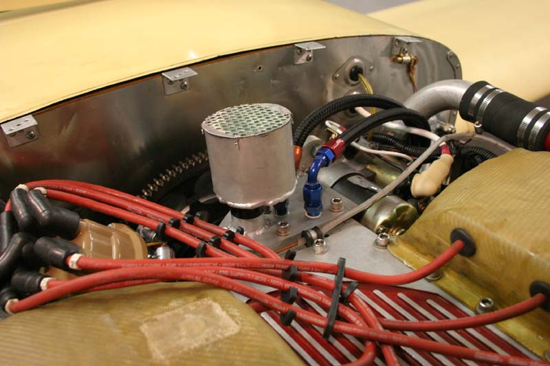 Another improvement I made with the oil system this time around was to move the return from the cooling/filtering loop from the old oil cooler return to this plate, because access to the old location was difficult with the starter in place. I used two different angles for connectors here, so as to make it obvious which one goes where, precluding reversal during installation. Note the one inch inside diameter tube welded to the top. This was intended for either a breather or a filler boss (the stock filler would fit perfectly), but at this point, I wasn't exactly sure how I was going to do it. That was tomorrow's job.