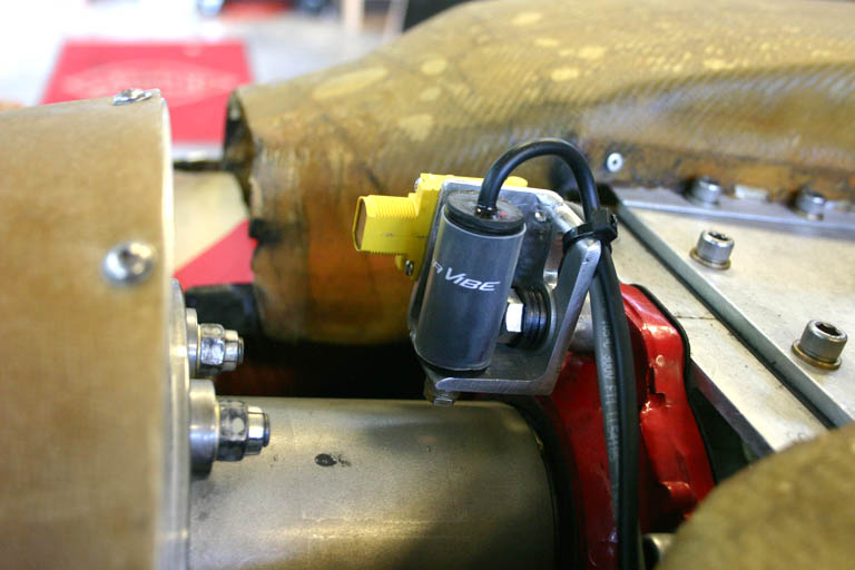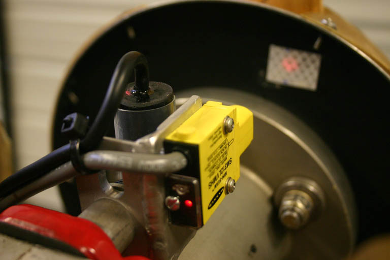 I mounted the accelerometer and optical proximity sensor the front of my Corvair engine, with the prox sensor shining on the back of the prop spinner. Here you can see the dim red glow on the reflective tape.