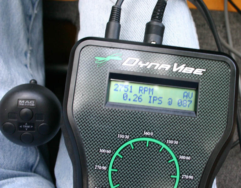 Then I heard about the "DynaVibe", which is only $1500...a LOT cheaper than the nearest competition. It's not quite as fancy as the really expensive ones, in that it doesn't draw plots, save data to files, or do three axes, but why would I need the axis that the crank runs in? What I need is the X and Y plane that's defined by the prop, and the DynaVibe handles that nicely. It also functions as a digital tach to verify if your installed tach is accurate.