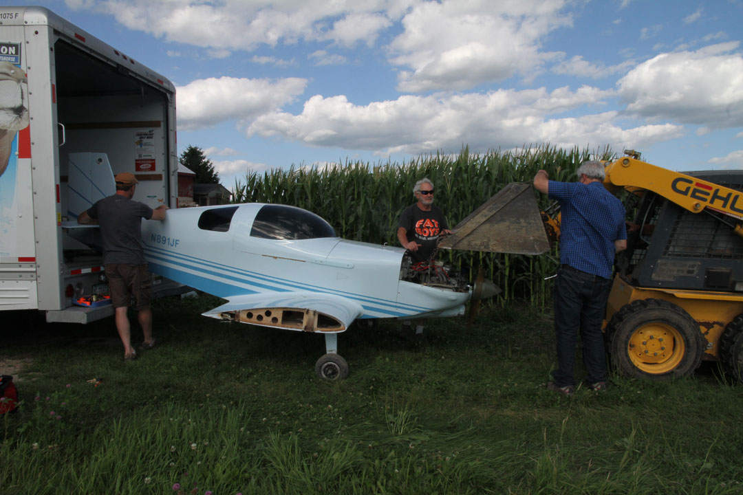 After hanging the wings, we used a "skid loader" (short bucket tractor like a Bobcat) to lift the fuselage using a chain and the engine mount. Several local volunteers were quite willing to help get the plane in the trailer also, especially Mike who lives in the house nearby. Larry Flesner flew into West Bend (the nearest town) to see what he could do, and Mark Jones volunteered to drive down also, but we already had it under control at that point. Thanks for the offer, guys.