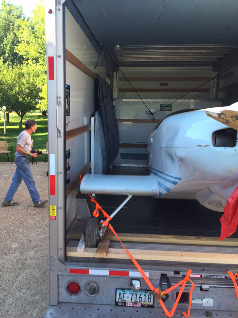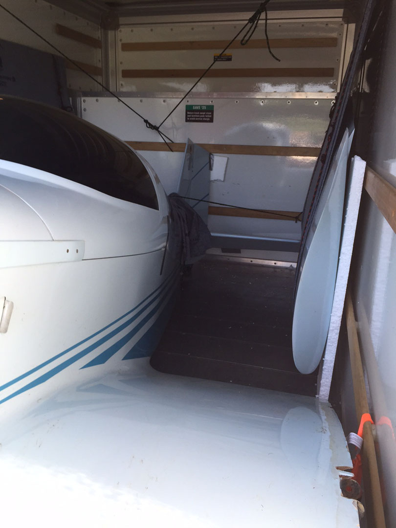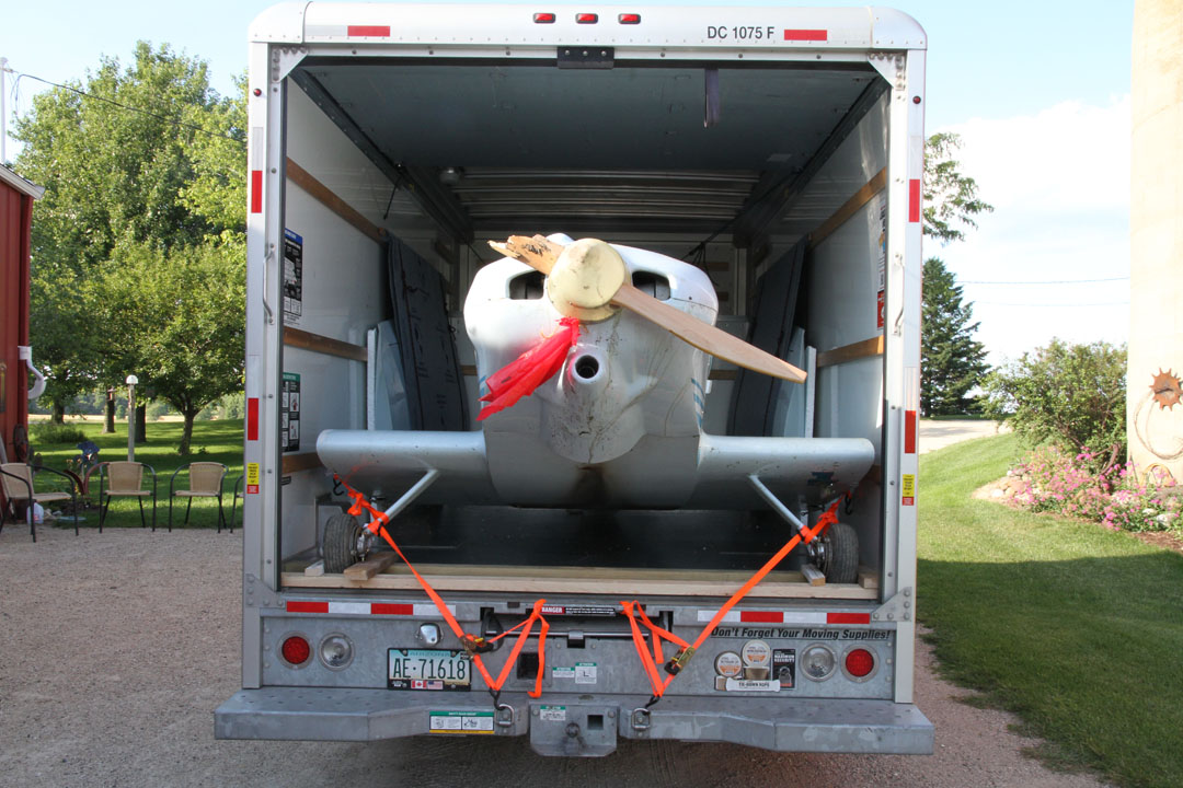 Notice how tight the fit was. The rudder was cranked all the way over to allow the wheels to fit within the box. The horizontal stab was within a quarter inch of the wing. Despite all the really rough northern roads (especially around Chicago) and the 800 miles of travel, I never had to retighten the ratchet straps, and nothing moved...not even an eighth inch. It was simply frozen in space in the back of this truck!
