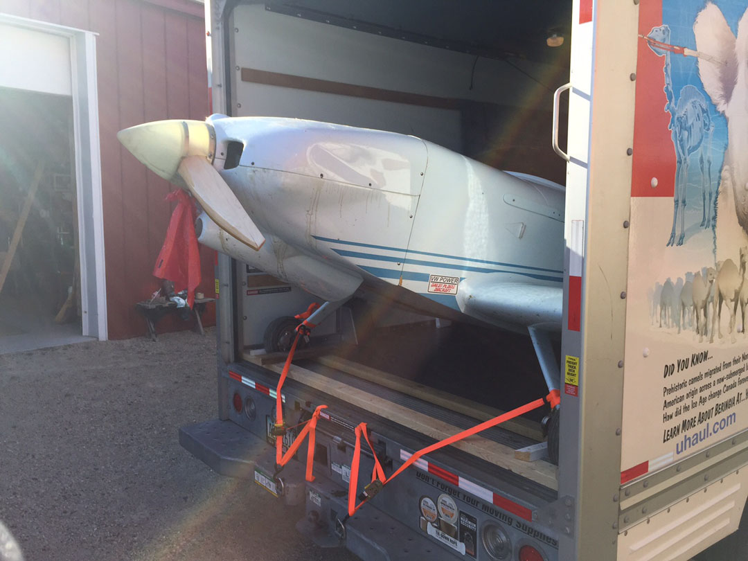 The thing I want to point out here is the amazing packaging job we did to get the airplane into a "fifteen foot" U-Haul truck. The 15' truck was the longest available locally, but when we picked it up it was clear that about 2.5' of that length was over the cab of the truck, so we really only have about 12.5' to work with. I was ready to kill more daylight looking for a longer truck, but Larry has moved many planes over the years, and suggested leaving the door open and immobilizing the plane. This guy's middle name is "Confidence".