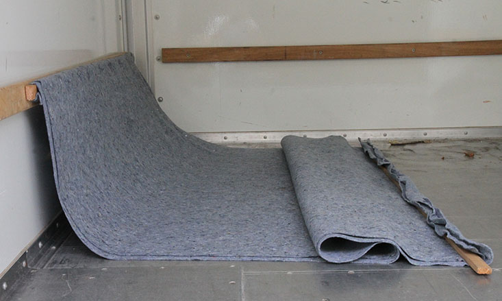 Another brilliant idea of Larry's was to make simple slings for the wings from the packing blankets, which completely protected the wings from damage. We used two U-Haul blankets, wrapping and stapling each end around 1x2 boards, and then screwing the sling to the tie-down slats in the truck, starting with the bottom one (see above). Then we held the wing in place and screwed the top end to the the upper tie-down. Larry also brought rope to reinforce the blankets as a backup support. They travelled just fine, without a scratch.