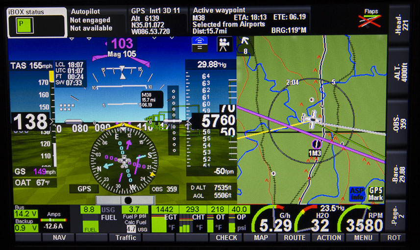 I took this during a "cuise speed" test. Although you wouldn't know it from the altitude or GPS altitude display, the density altitude (also displayed) was 7535' which is in the range of 75% engine performance. True airspeed (shown as TAS) was 155mph. Disregard the -50fpm descent rate...it was steady-state level, but the iEFIS jumps all over the place. It could just as easily read -150fpm!