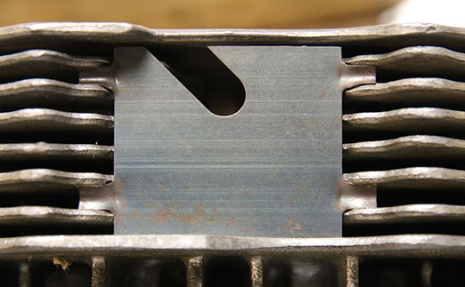 This "cooling plate" came on all heads from the VW factory, but you rarely see them on aftermarket heads, unless somebody installed used ones like I did. These prevent the cooling air from simply venting below, and ensures that instead passes over some fins first. I pried them out with a screwdriver and had them reinstalled in under a minute each. The slot is for the factory installed bellows control rod that opens the Beetle's fan shroud flaps. I taped over it with aluminum tape on both sides to close up this leak (and yes, I had to pry it back out to do that).