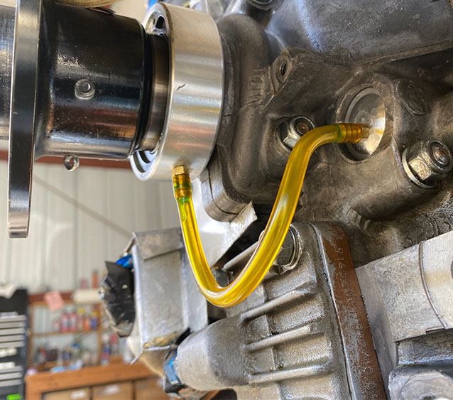I thought it was worth a try, especially as simple as the process was, so I started looking through my "small brass fitting" box to see what I had on hand. Eventually I came across a small zip-loc bag that contained two tiny fittings, connected with a piece of 1/8" ID thick wall urethane tubing. Then it came back to me....Steve Bennett had mailed me that kit back when I called him about the problem, and I already had the parts I needed! Marcel's instructions filled in the gaps (like the tiny hole at the top of the bearing to provide a "vacuum break" to allow the oil to drain), and his word that it had completely fixed the problem convinced me to see if it would work for my engine.