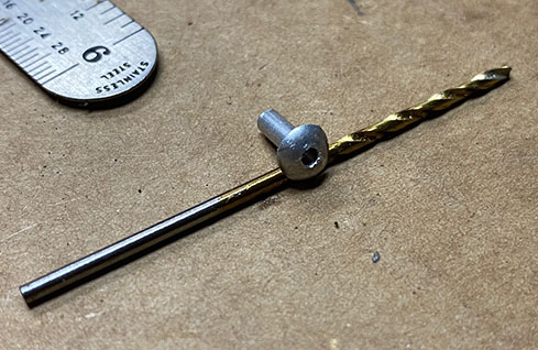 I was concerned about it becoming an oil geyser, so I devised a plug consisting of an AN-3 size rivet, about 3/8" long, which (it just happens) is 0.094" in diameter. I chose an "A" rivet rather than an "AD" rivet, because the A is softer aluminum than the AD, and would be easier to drill. Then I mounted it in a drill vise under the drill press, center punched the head, and drilled a hole all the way through it using a #56 (0.0465") drill bit. Why a #56? It meets the criteria of "tiny", and more importantly, I broke my smallest bit (a #60 at 0.040" diameter) trying to drill the first one!