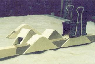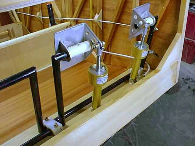 I made my rudder cable fairleads out of spruce and plywood scraps. The problem with these is that you can't get the cable out without cutting it. But I can't really think of why you'd need to remove the cable unless you were replacing it anyway. Still, I'd try a little harder to figure out a way to make them removable. This picture shows their construction, using packing tape and a spar piece of 5/8 spruce as a jig. I used Nylaflow tubing as a conduit through the passenger area.