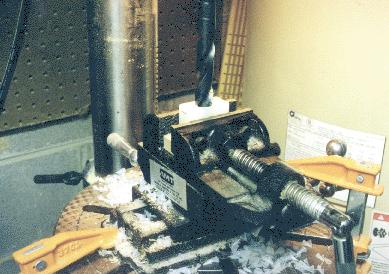 The nylon rudder blocks were made from 3/8" x 1" nylon bar available from Wicks. A drill press is required, along with a drill press vice. Clamp two pieces of materal in the vice (upper and lower halves) on edge, and drill a 5/8" hole on the dividing line of the two pieces. It helps to use a block of wood underneath the nylon so you don't drill a hole through your vice.