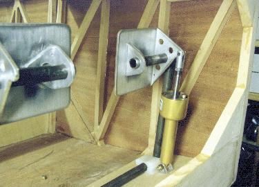 This picture shows the final result, except that a few bolts are missing. Note that my nylon bearing blocks are only 1" wide. This will provide plenty of bearing surface for this job. The blocks are fastened to the fuselage floor with AN3 bolts countersunk from the bottom of the fuselage. The brake cylinders are Matcos. They are mounted to the floor with a lightweight 3/4 x 3/4 x 1/8 6061-T6 channel and one bolt, rather than two angles and two bolts. Another few ounces saved!