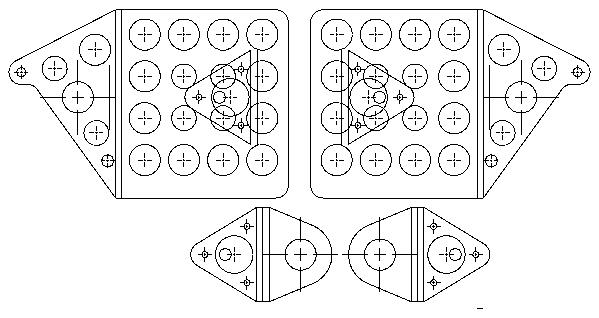 I drew up pedals on CAD, and integrated the pivot point for one side into the pedal itself (download rudped.pdf for a full size drawing). The plans version calls for bolting a piece of 3/4 channel to the pedal to act as a pivot. By integrating one half of the pivot into the pedal itself, I was able to replace the channel with an angle, while spreading the two pivot points 3 inches apart, rather than 3/4". Loading will be better, and should bind less than the stock arrangement. The pedals and brackets were cut out on my "wood cutting" band saw. The angle which serves as half of the pivot was bonded to the back of the pedal with some incredible stuff sold by Tra-Bond. Mark Lougheed sent me a sample, and it's tenacious stuff similar to JB Weld. Saved a few ounces on bolts and nuts here! The drawings above show lots of lightening holes, but I've yet to cut them out. That should help some more.
