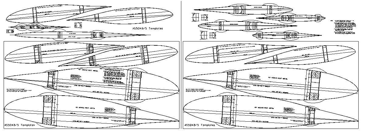 One of our products was airfoil templates for the AS5045, AS5046, and AS5048 "new wing" sections, as well as for horizontal and vertical stabilizers. These were plotted out full size on paper (to be glued directly to ribs) and included enough templates for one airplane. These templates used the standard planform, and either stock or modified spars. They were high quality, derived from bspline curves, rather than a french curve, and left very little to the imagination. They were not blueline or Xerox copies, but were direct from a very accurate plotter.