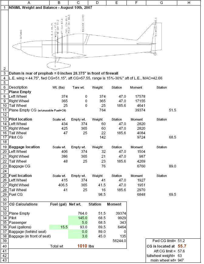If you don't have Excel, this is done just like the weight and balance form supplied with the KR plans, but it's just easier to use and has a few more functions. I guess if I were really dedicated, I'd make a weight and balance sheet that looked just like the one in the KR manual, but I'm not that dedicated at the moment.